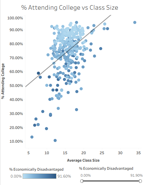 While I found a weak relationship between class size and college attendance, I did find that there is a notable relationship between economic disadvantage and college attendance. Represented by shades of dark blue (lower college attendance) and light blue (higher college attendance) in the scatterplot above, there is a strong negative correlation between the two variables. Schools with less economically disadvantaged students tend to have a higher percentage of students attending college. On the contrary, schools with a higher population of economically disadvantaged students tend to have a lower percentage of students in college.