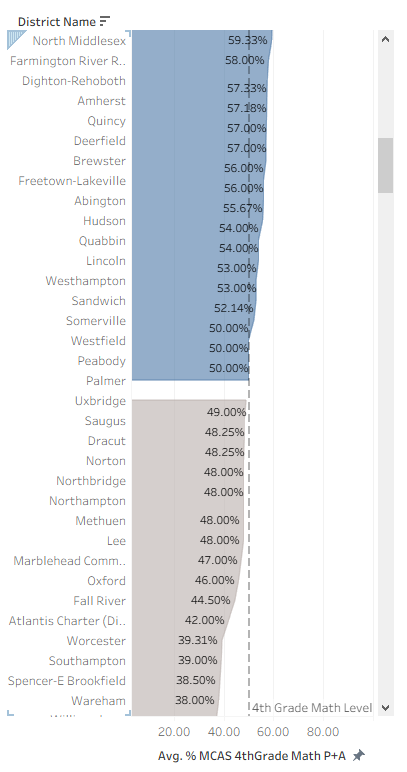 According to the Massachusetts Commissioner of Education, 4th grade math scores are a key indicator of a student’s future success in the subject. The scores within the dataset are reflective of the grading structure established by the The Massachusetts Comprehensive Assessment System (MCAS) that categorizes students (grades 3-8) according to the following levels: Proficient (P), Advanced (A), Needs Improvement (I), and Warning (W). For the sake of this analysis, the focus is on a grouping of P+A (scores of at least 50%).