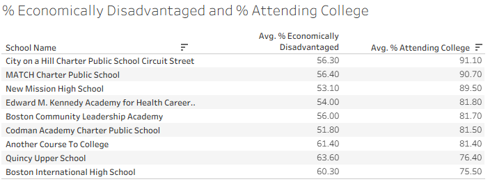 Although the strong trend between those variables exists, there are some schools that are outliers. When filtering for the top 10 schools with an average of at least 50% economically disadvantaged students and an average of at least 75% students attending college, we see the following: