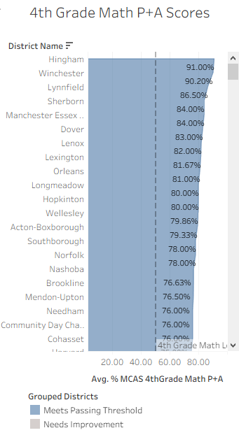 The district with the highest average was Hingham, with 91% of their students scoring a P or A in the MCAS assessment. The district with the lowest average was Tec Connections Academy Commonwealth Virtual School with 17% of their students scoring a P or A.
