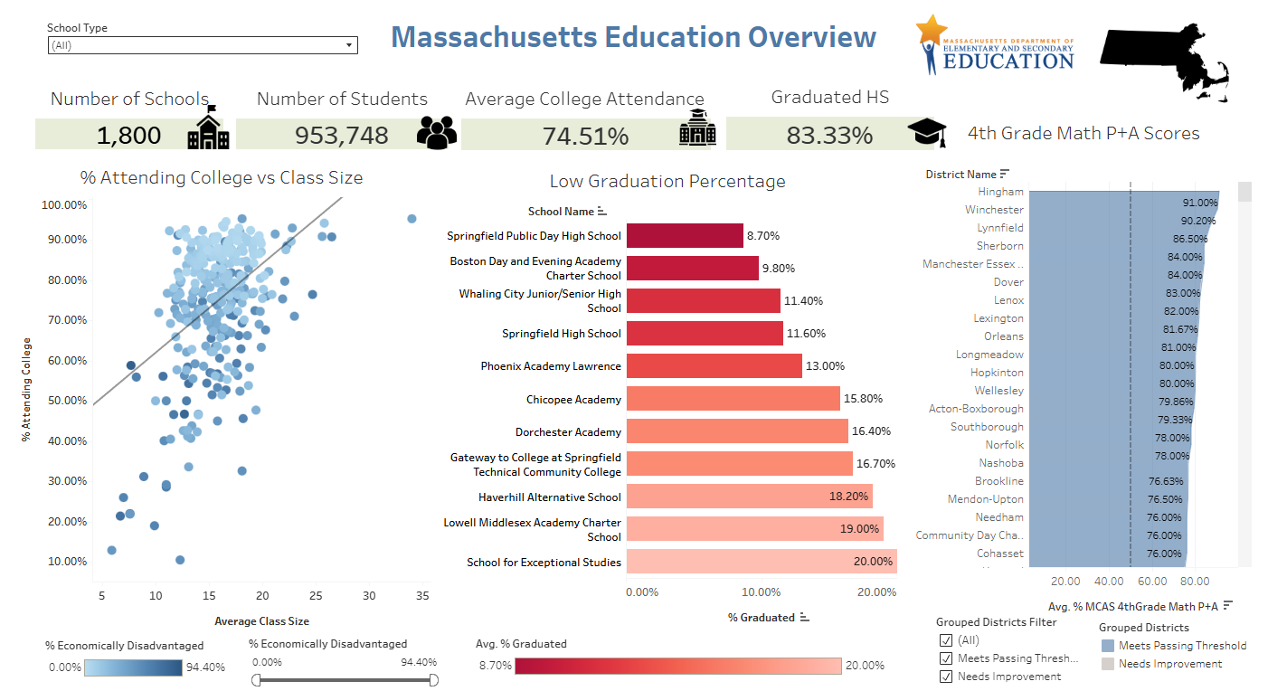 Using Tableau, I analyzed and visualized data from various schools and districts throughout the Massachusetts area. The focus of the project was finding answers to the following questions made by the Commissioner of Education for the State: